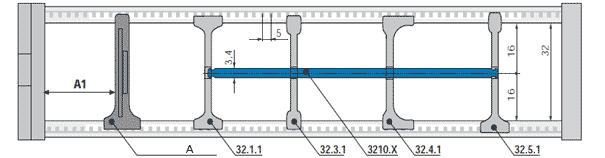 표준형 igus® 분리대는 매 두 번째 체인 링크마다 장착 됩니다. A = 중간 링크 A1 = A1 치수는 외부 반지름 AR에 의해 고정되었습니다! 분리대 32.1, E-Chain® 과 e튜브에서 최대 유지력과 안정성을 갖고 있는 광폭 베이스 igus® 스냅 오픈 크로스바 385.X. 용 분리대 32.2 Q. 광폭 베이스의 한쪽은 확실히 고정, 반대편 좁은 쪽은 케이블을 용이하게 설치 (간편하게 고정). e튜브에서도 이용 가능 분리대 32.3 직경이 가는 케이블이 많을 때 서로 옆으로 포설하기 위한 작은 폭 베이스의 분리대. 공간 절약 - E-Chain® 및 e튜브 용 측면 장착 용도로 사용할 경우, 비대칭 분리대 32.4로 지정한 거리에 장착할 수 있으며 스페이서를 사용할 필요가 없습니다. 예. 측면 장착 용도 E-Chain® 과 e튜브에서 잠금식 크로스바용 잠금식 분리대 32.5. 잠금식 크로스바에 눈금표시 E-Chain® 과 e튜브에서 정확한 위치에 장착 용도 전폭 가로분리대 3200.XX (내부 폭 50 - 250 mm). 분리대의 양 끝에서 안전하게 잠기며, 고정된 너비 가능. 추가 분리대를 어떤 수평 방향이라도 가로분리대에서 이동할 수 있습니다. 1 가지 단계로 이용 가능