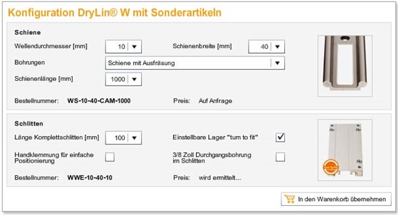 다양한 샤프트 치수와 레일 너비 중에서 선택하시고(경량룡 레일 옵션도 선택 가능), 필요하신 홀 패턴도 선택할 수 있습니다. 귀하는 또한 레일의 개별 길이를 기입할 수 있고, 가격도 자동으로 계산해드립니다. 레일을 위해 적합한 캐리지는 미리 선택됩니다; 캐리지 길이는 조정 가능합니다. 게다가 "조정 가능한 베어링" 또는 "핸드 클램프" 옵션도 선택할 수 있습니다. 레일과 캐리지를 제시된 가격으로 쇼핑카트에 직접 담을 수 있습니다. 필요하시다면 원하시는 수량도 거기에서 조정 가능합니다.