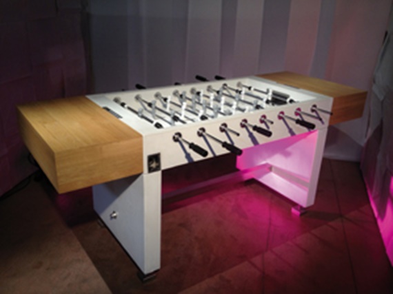 This football table, made of concrete, allows accurate goal kicks and defensive actions every time. The kicker rods are guided by robust and resilient plastic bearings. No lubricants are needed, so the kicker is almost maintenance-free. The plastic bearings are on the inside, providing also a visual advantage and blending harmoniously into the elegant kicker design.