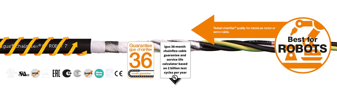 특징: 케이블에 대한 요구는 매우 높지만, 모든 chainflex 케이블과 동일한 36개월의 보증을 제공합니다. 어떤 점이 특별할까요? 비틀림 케이블은 다른 제조업체에서도 생산하고 있습니다. 하지만 아무도 케이블 사용 기간이나 보증에 대해서는 정확한 설명을 제공하지 않습니다. chainflex 사용 수명 계산기는 케이블의 수명과 교체 시기를 정확하게 알려줍니다. 이는 테스트 결과를 의미있고 비교 가능하게 하는 이구스의 "토션 테스트 기준"에 의해서 이루어집니다. 이 기준에 따라 모든 chainflex CFROBOT 케이블은 1 m의 고정 길이로, 비틀림 각도 ±180°인 triflex R 에너지체인에서 최소 5백만회의 토션 테스트를 거칩니다; 신제품 CFROBOT7 케이블 또한 동일하게 테스트되었습니다.