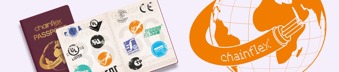 산업별 지침 또한 빼놓을 수 없습니다. 반도체 산업에서는 IPA 클린 룸 승인이, 해양 산업에는 DNV-GL 인증이 필요한 반면, DESINA가 중요한 역할을 하는 경우도 있습니다. chainflex®를 통해 모든 요구조건을 충족하실 수 있습니다. 전세계 어디서나, 안심하고 사용하세요!