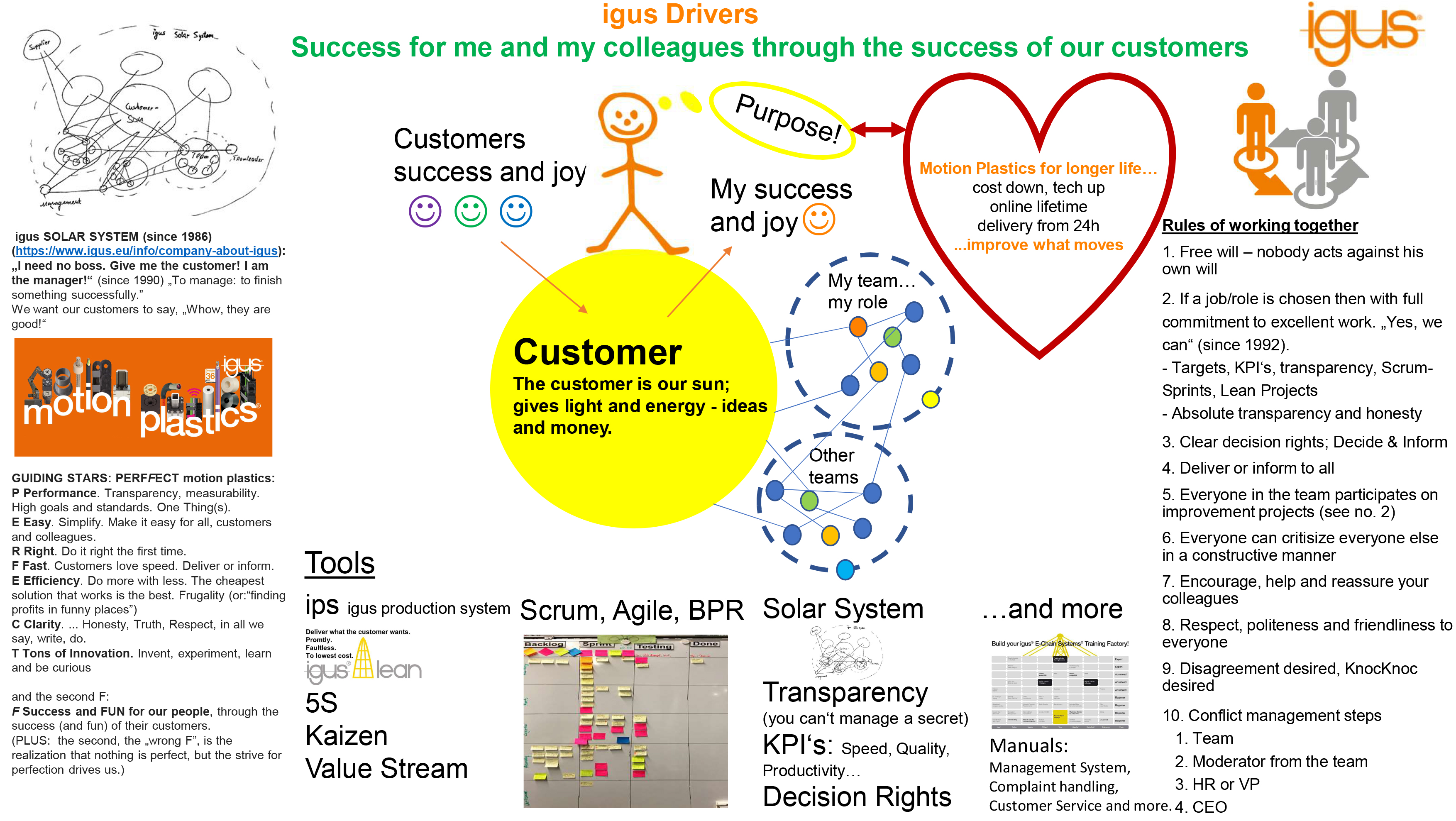 igus®에게 고객은 모든 활동의 중심입니다. 우리에게 고객은 태양이 지구의 생명체에게 중요한 것처럼 빛, 열 및 에너지의 원천입니다. 고객은 우리에게 아이디어와 에너지를 주며, 우리가 성장하고 발전하도록 도와줍니다. "이구스 솔라 시스템"은 당사의 기업 철학에 단단히 뿌리를 내렸습니다. 직원들과 팀들은 행성처럼 고객 주위의 궤도를 돌며 고객이 원하는 것을 메모하고, 고객이 겪는 문제에 대한 해결책을 찾습니다. 고객이 만족하면 우리도 만족합니다.